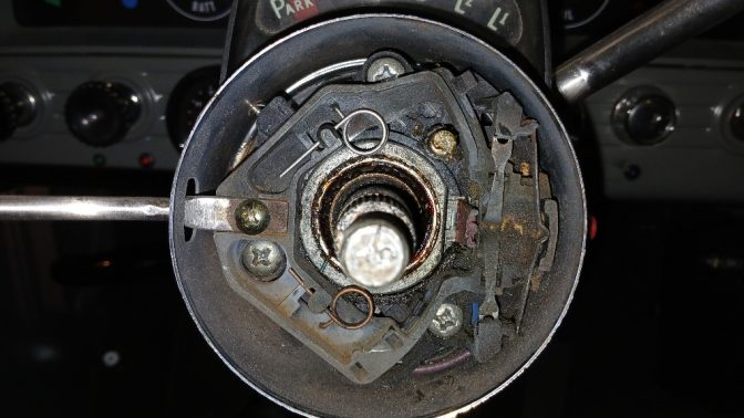 ISSUE #2 – SIGNAL STALK CANCEL MECHANISM: One of the signal stalk cancel mechanism springs broke inside the column and honked the horn for me. And the signals didn’t cancel. I fabricated a new one (top) out of 0.045″ round (RC Servo linkage wire?), and it’s back in business.
