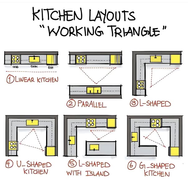 - GOOD Kitchen designs have a “Triangle” of work space: the SINK and the STOVE and the FRIDGE are a triangle of operation. Try to do that.