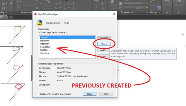 From the PAGE SETUP MANAGER click [NEW]. If you know that you are going to print different pictures from the same file, give it a name that makes sense to you (like “Elevations” for Elevation views).