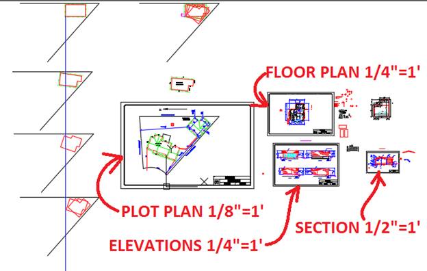 My workshop CAD drawing has FOUR different printable drawings, all with titleblocks scaled to fit. The CAD file also includes my experimentations as I tried to figure out the best floor plan layout: