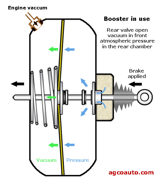 The brake power booster uses atmospheric pressure and engine vacuum to provide additional braking force. In order for the power assist to work, the engine must be running. A large round drum is mounted on the firewall directly behind the master cylinder. A link from the pedal assembly goes into the power booster, and a link from the power booster goes to the master cylinder. Inside the power booster, there is a rubber-sealed diaphragm that separates the atmospheric side (the brake pedal side) from the engine vacuum side. When the brake pedal is pressed, a small valve is opened, allowing atmospheric pressure to enter, an push against the diaphragm (trying to collapse the engine vacuum). This pressure, against the surface area of the booster diaphragm, adds considerable force. The caveat in the system is the engine must be running. If the engine quits, you lose the vacuum to make the system work. You will still have brakes and can still stop the car, but it will take a lot more force to do so.