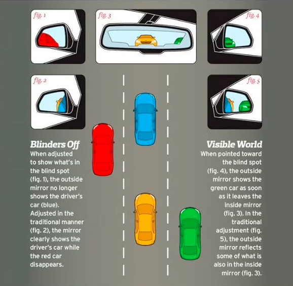 MIRRORS AND VISIBILITYThe rearview mirror is pretty easy to figure out. The side view mirrors should NOT show any part of your car – we don’t care where YOUR car is, we care where other cars ARE. The side mirrors should be adjusted so far out, that you have to move your head to the door glass or center of the vehicle to see what’s behind you. In this position, when the car behind you disappears from the REARVIEW mirror, it is now perfectly visible in the SIDE VIEW mirrors. When it disappears from the SIDE VIEW mirrors, it is not BESIDE you, and can be seen with a SHOULDER CHECK. I’m serious. You will be a FAR BETTER driver if you set your mirrors like this (top images, shown below).