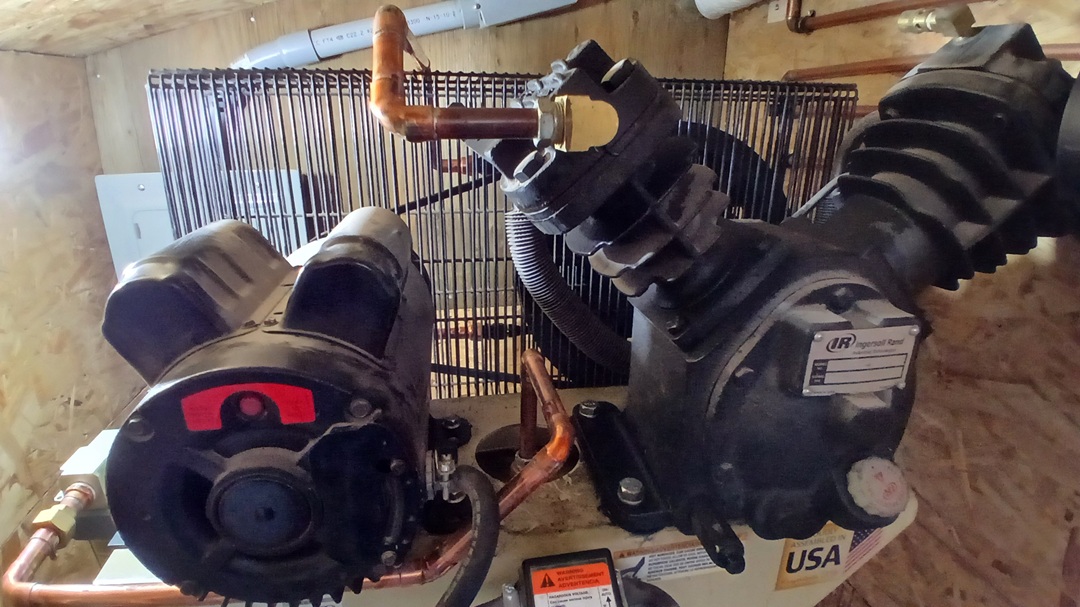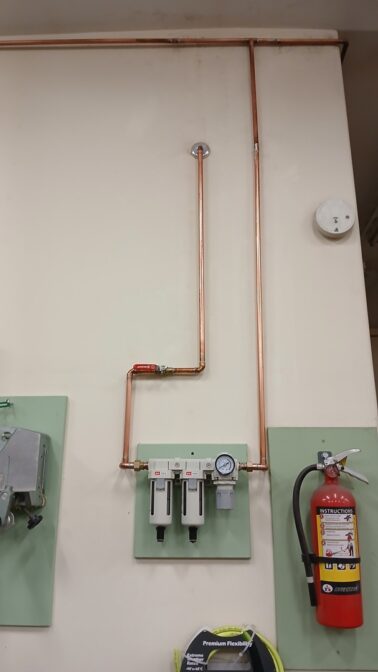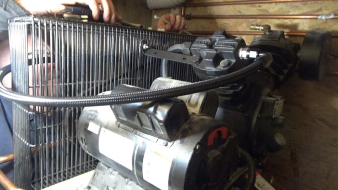 The compressor plumbing has been altered such that the compressor itself feeds a 1/2″ 16-pass transmission oil cooler, into a water separator, and into the tank. The tank output goes through about 24′ of zig-zag 1/2″ copper pipe up the wall to help cool the air, protruding into the shop via a flexible line Future Me: “Don’t use regular plumbing solder – use Silver Solder, or Silicon-Bronze, or maybe even AN lines.”