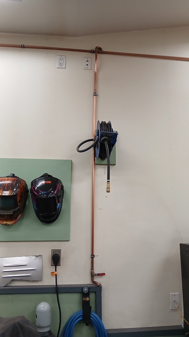 Shop air runs through two filter/water-separators, and is regulated to run through the shop. The line goes UP, to a downward-sloping circuit running around the top of the wall in the shop. Each leg T’s UP first, and then drops down T’ing off to a retractable hose reel at about 7′ height, and then continuing down to the foundation walls ending at a ball-valve drain. The last leg of the sloped run is a drain only. I used copper pipe because I was given a lot of it. It was all scuffed, soldered, and clear-coated for a sort of “Steam Punk” vibe.